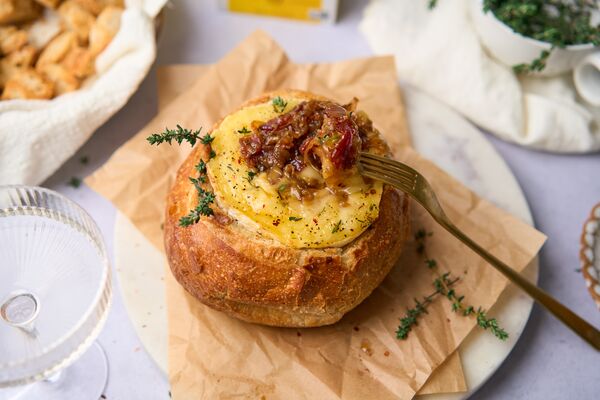 Baked Camembert in a Bread Bowl with Bacon and Onion Topping