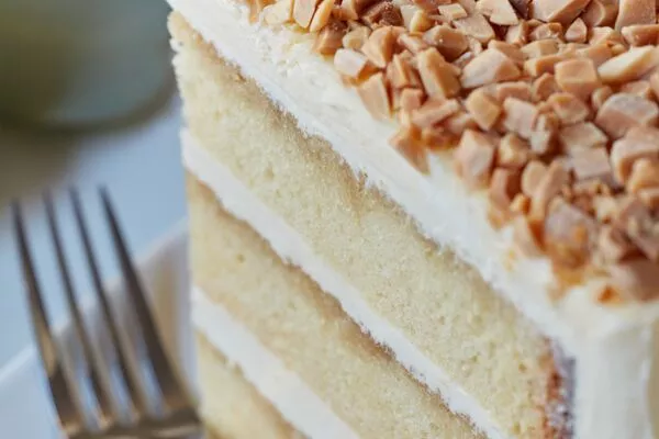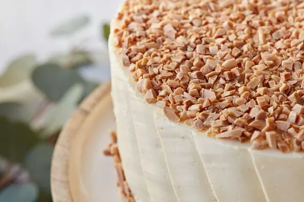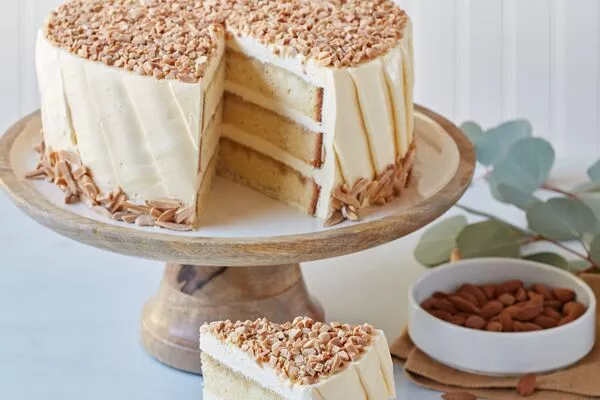 Assemble the cake. Place one cake layer on a serving platter. Drizzle with simple syrup. Using an offset spatula spread a layer of buttercream over the cake. Place another cake layer on top and repeat the process. Spread buttercream on top and sides of cake. Fill a pastry bag fitted with an oversized basket weave decorating tip with buttercream. Decorate the cake by piping buttercream in a diagonal motion. Top with chopped almonds and decorate the sides with slivered almonds.