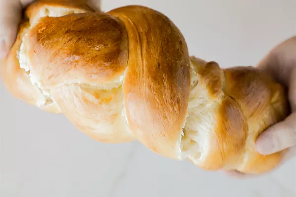 Turn dough out onto a lightly floured cutting board. Cut dough into 3 even pieces; then roll each piece into a 12-inch long rope. Place the pieces next to each other along the length of the prepared sheet pan; then braid the pieces, tucking and pinching the ends under the loaf.