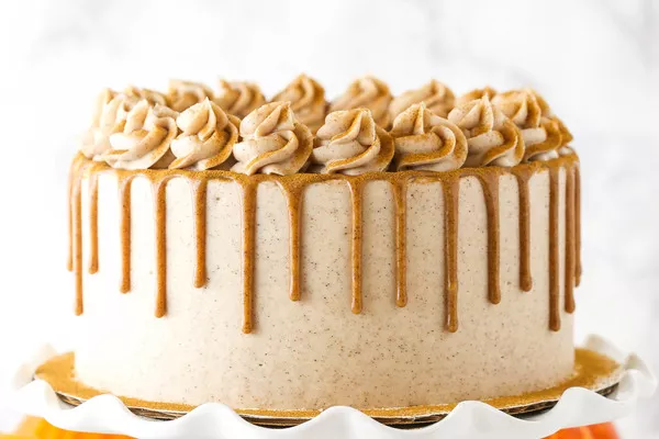 Pipe swirls of the remaining cream cheese frosting around the outer top edge of the cake and dust with ground cinnamon.