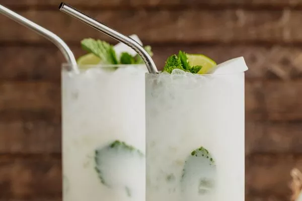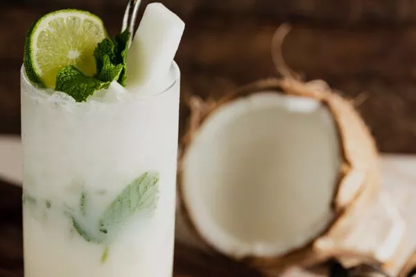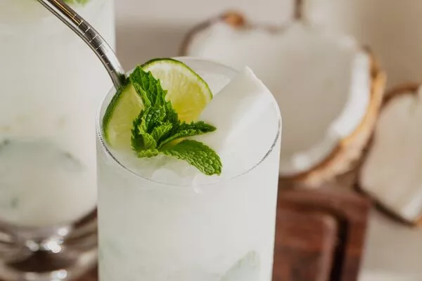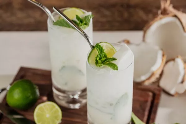 Add ice and top with club soda. Stir. Garnish with a mint sprig, lime slices, and fresh coconut. Enjoy!