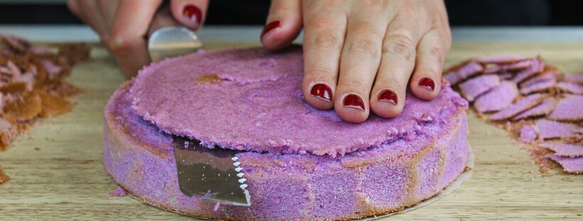 Once fully cooled, use a serrated knife to level the tops, sides, and bottom of the layers, to remove any caramelization.