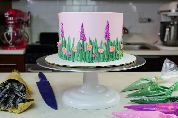 Place into separate piping bags, and pipe a floral design around the sides of the cake.
