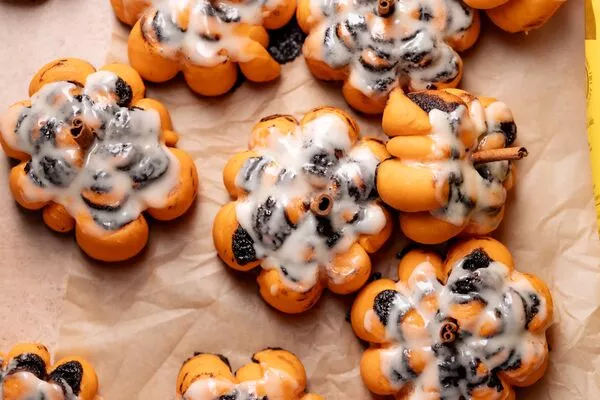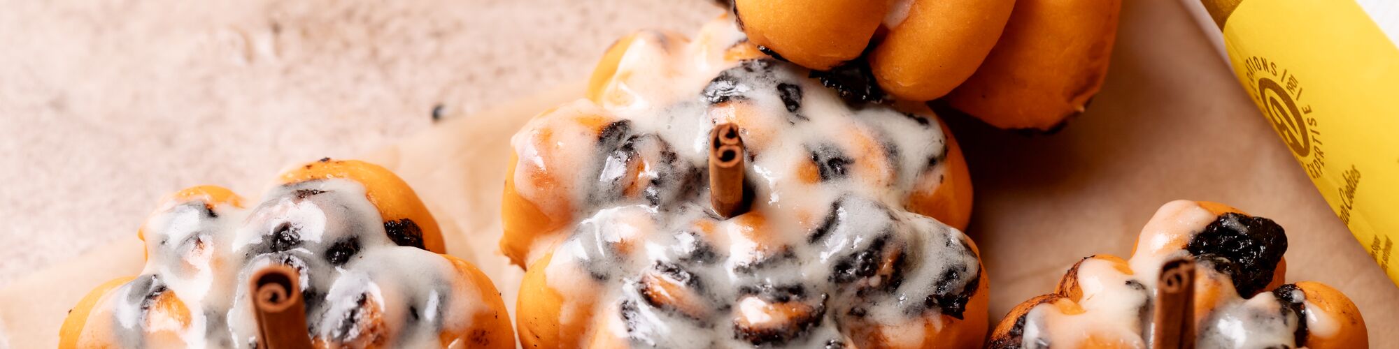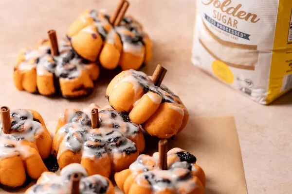 These Halloween-themed cinnamon rolls are the perfect addition to your Halloween treat line-up! The pumpkin-shaped cinnamon rolls made with Domino® Golden Sugar are filled with spooky black cocoa cinnamon sugar swirls and topped with a creamy cream cheese glaze.