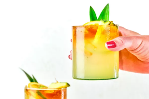 Pour mixture into two glasses filled with ice. Float the dark rum slowly pouring over the ice. Garnish.