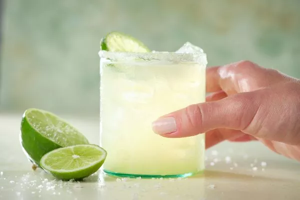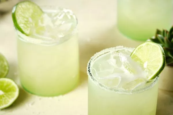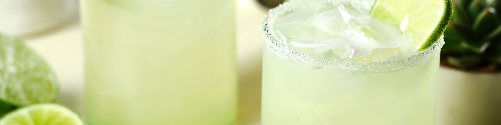 Pour mixture into the rimmed glasses. Fill with ice. Garnish with lime slices.