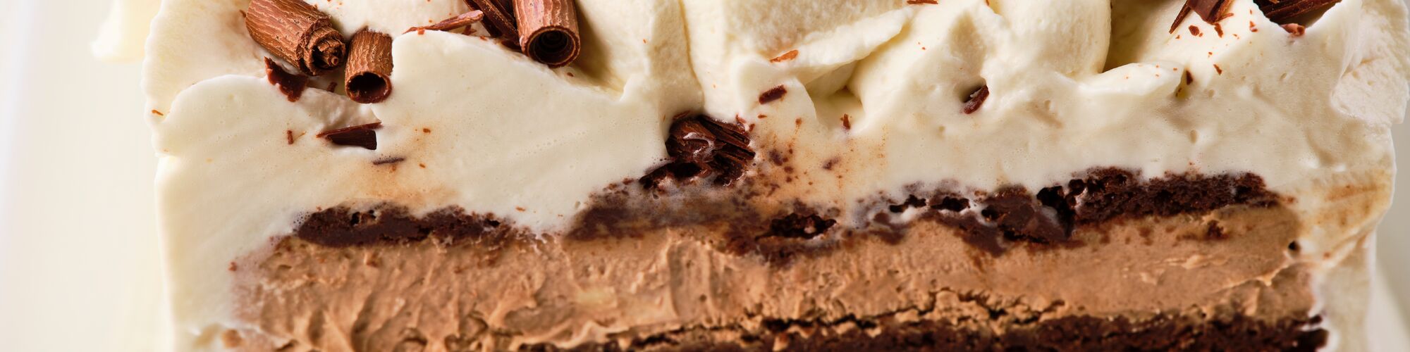 To finish topping the cake, remove cake from the freezer, and remove from the pan. When the cake has been removed, remove the plastic wrap that is on top of the cake and place the inverted cake on a serving plate or dish. Remove the rest of the plastic wrap. Using a small off-set spatula, ice the sides and the top of the cake. The top will be decorated with the remaining topping, so it does not need to look perfect. Take the remaining topping and place it in a pastry bag that is fitted with a number 124 rose piping tip. Twist the top of the bag and hold the bag with one hand on the twist part of the bag. Decorate the top of the cake by holding the bag at a 45° angle and have the narrower part of the opening pointing down. In a sweeping motion with light pressure on the bag, sweep to the side, up, and then down to create a flower-type petal. Pipe the petals on one side, and then turn the cake and pipe the same petals on the opposite side. Top the finished cake with the grated chocolate. The cake should be eaten immediately after decorating.