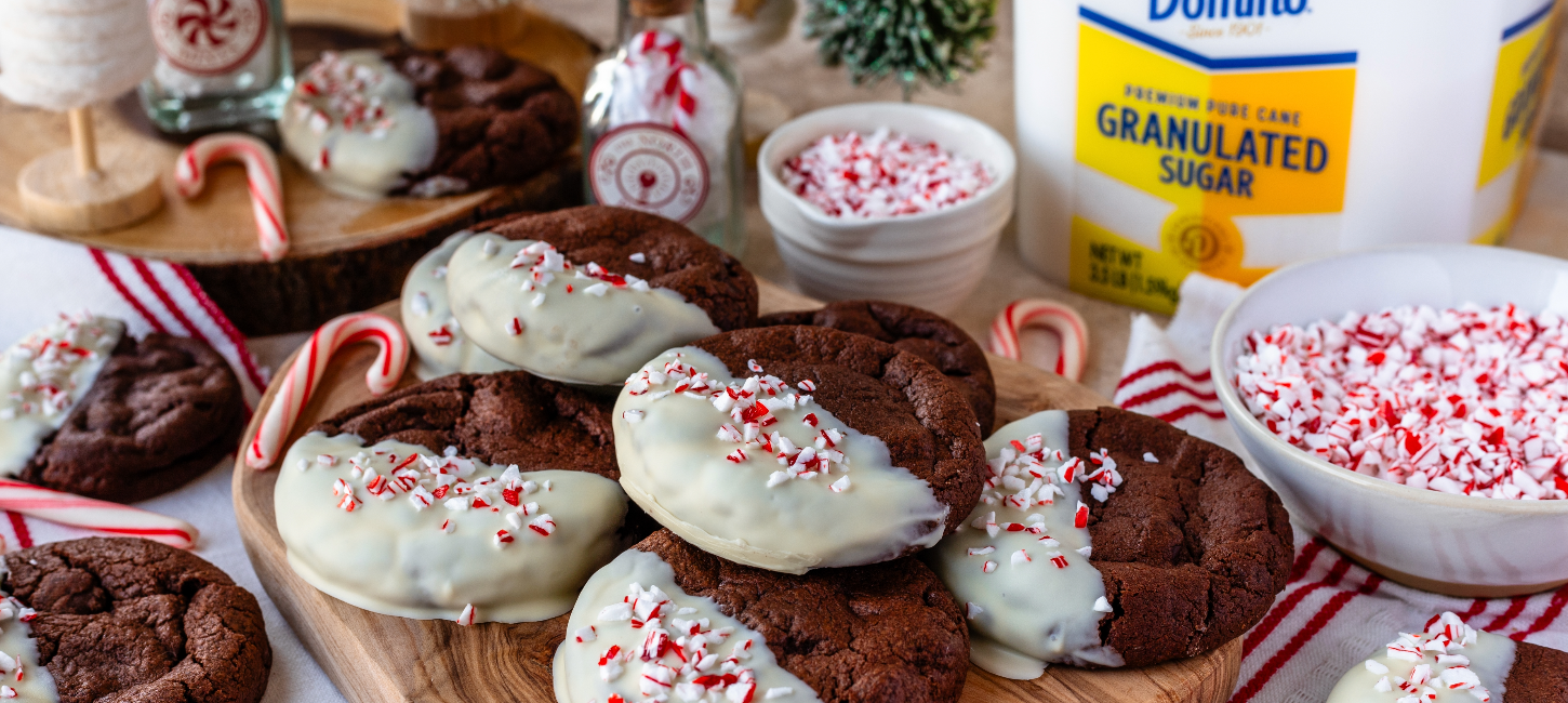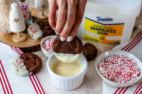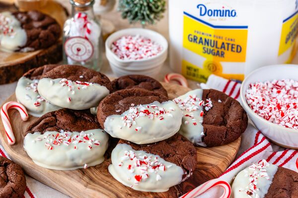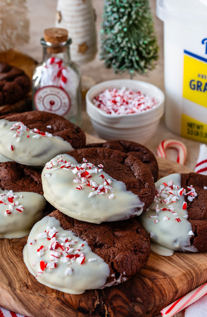 Let the cookies cool down for at least 30 minutes then place the chopped white chocolate in a medium bowl. Melt the chocolate by microwaving it for 15 second intervals, stirring in between.When the chocolate has melted entirely, add the shortening and the peppermint extract, and stir to combine. Dip the half of each cookie in the melted white chocolate then place the cookies on a baking sheet lined with parchment paper or silicone mat. Sprinkle some of the crushed candy cane on top of the chocolate.