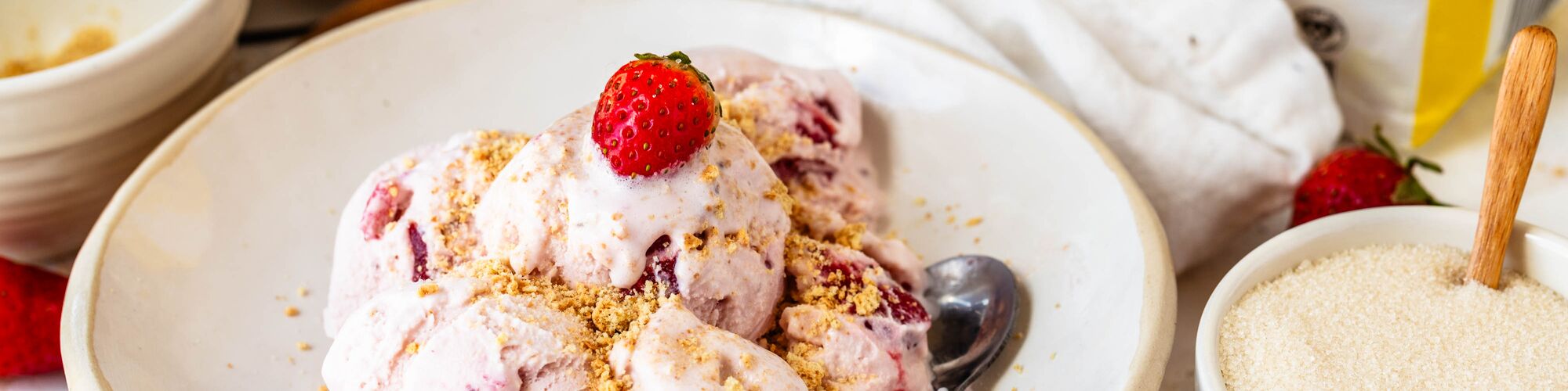 With a spoon, create a 2-inch wide hole that reaches the bottom of the pint. Add the preserves, graham crackers, and fresh strawberries. Assemble again the pint into the machine and press MIX-IN. When processing is complete, remove from machine and serve.