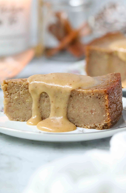 Serve slices of sweet potato pone with brown butter coconut sauce poured over top.
