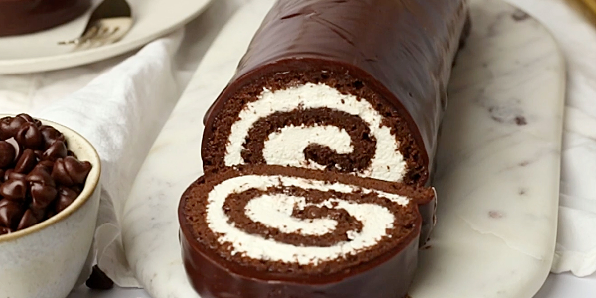 Pour the mixture into the prepared pan. Using an offset spatula, evenly spread until smooth. Bake for 8-10 minutes or until the cake springs back when touched. While the cake is baking, lay a kitchen towel on the counter and sift 1 tablespoon of cocoa all over it. Remove the cake from the oven and allow to cool down for 5 minutes. Invert cake into the prepared towel and remove parchment paper. Starting with the narrow end, roll warm cake tightly with the towel. Cool to room temperature.