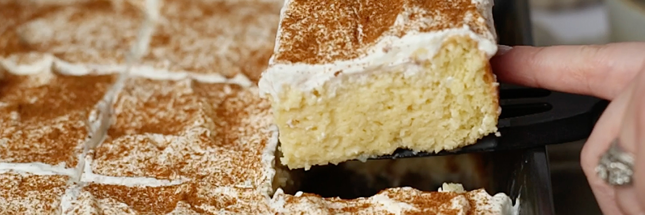 Combine the condensed milk, evaporated milk, cream, vanilla, and rum. Mix until well combined. Slowly, pour the mixture over the cake until all the mixture soaks in. Cover and refrigerate for at least 3 hours.