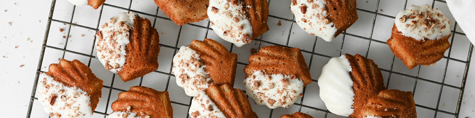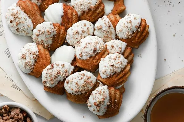 Dip edge of cooled madeleines into melted white chocolate and place on parchment paper. Sprinkle candied pecans onto melted chocolate and let set.