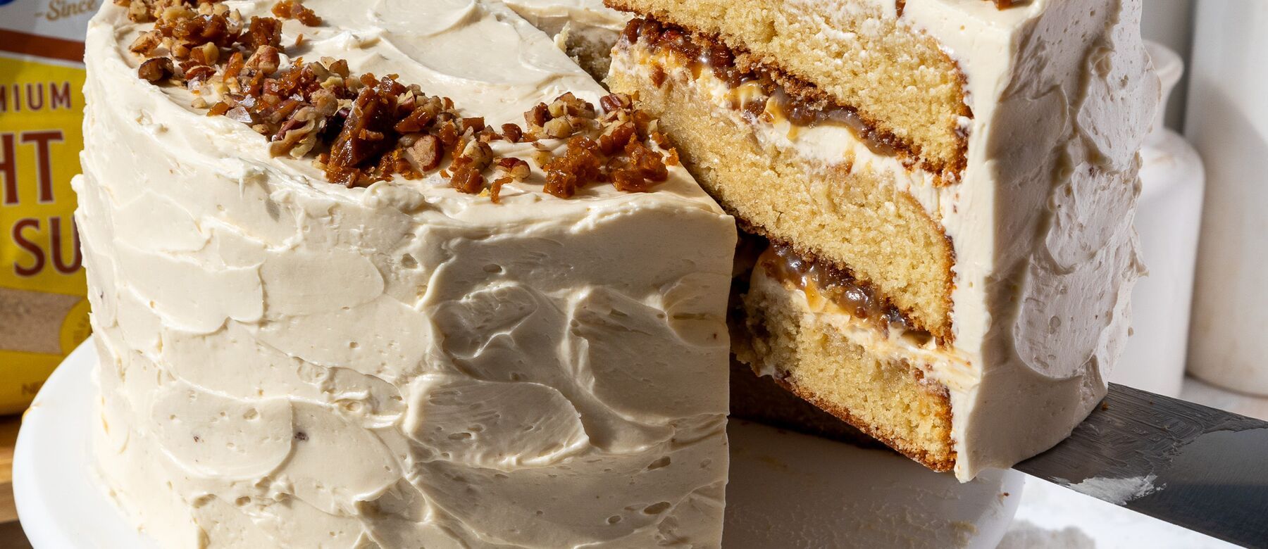 - Then spread a thick coat of butterscotch frosting around the cake using a large offset spatula to give it a beautiful textured finish. Sprinkle some of the toffee bits and pecans in a ring around the top of the cake, then enjoy!