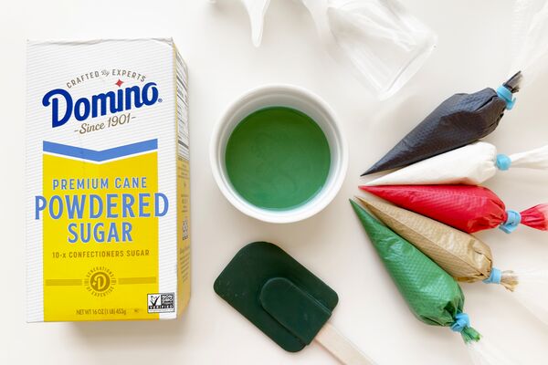 There’s a fine line between the perfect piping consistency and a sloppy sugary mess—even I can still mess this up after 12 years of experience! I recommend using a small spray bottle to thin the icing down and keeping a small box of Domino® Powdered Sugar and a spoon handy to thicken it up again. Don’t be afraid to go back and forth between water and powdered sugar until you nail the consistency. I usually have two piping bags of icing per color: