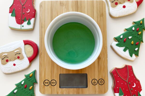 Have you ever experienced the dread of icing a tray of cookies, just to realize you don’t have enough icing to finish all the cookies you made?! To avoid this, use a kitchen scale to weigh your icing when mixing each color. Generally, it takes about 20 grams of icing to flood the base of a cookie. (i.e. 12 cookies = 240 g) Additionally, I like to have about 50-60 grams of icing in a piping bag of detailed icing. One batch of royal icing using 2 lbs of Domino® Powdered Sugar will make enough to decorate about 4 dozen cookies.